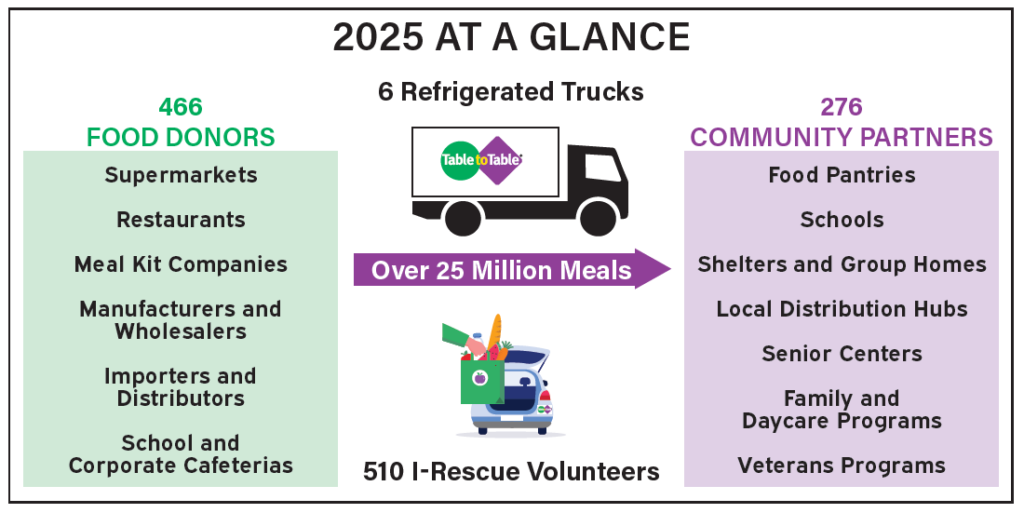 Table to Table is New Jersey’s first and largest food rescue organization. We accomplish this in two ways. We operate a fleet of refrigerated trucks for the daily pick-up and delivery of fresh, nutritious food. And, through our app, Table to Table I-Rescue, volunteers play a big role in our success by picking up food from grocery stores, restaurants, and other food-service locations and dropping it off at our local community partners, including food pantries, senior centers, veterans’ programs, and community kitchens.